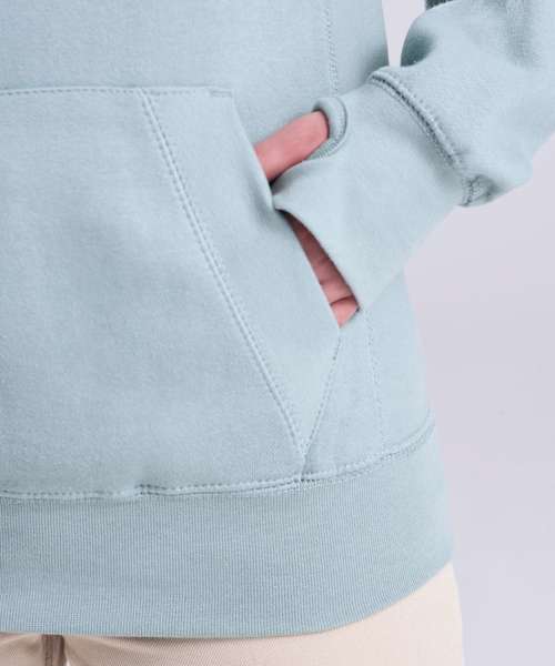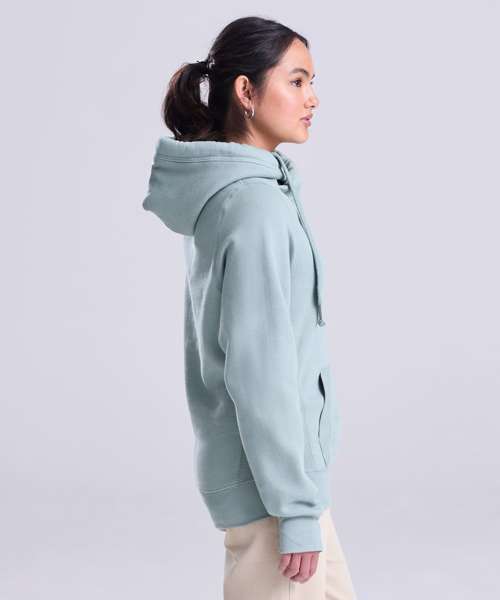 Heavyweight hoodie. Cross over neck detail. Twin needle stitching detail. Three panel double fabric hood. Flat lace drawcords. Kangaroo pouch pockets. Ribbed cuffs and hem. Soft cotton faced fabric created ideal printing surface. Simple tear out label makes it perfect for rebranding. Brushed inner fleece. Thumb holes in the cuffs.